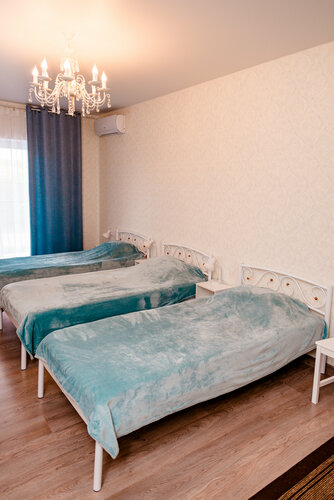 Двухкомнатный номер с выходом на балкон предназначен для проживания до 5 человек. Первая комната оборудована двуспальной кроватью 160х200, вторая 3 кроватями 90х200.В номере есть кондиционер, холодильник, телевизор,тумба для телевизора, чайник.