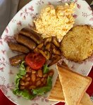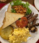 Комплексный завтрак. В составе: глазунья из двух яиц, сосиски, баклажанная икра, зелёный горошек, горчица. Подаётся с ржаным хлебом из нашей пекарни