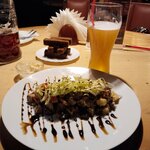 Любителям пива и мяса посвящается. Мясные блюда сытные вкусные кому нравится жирная пища зайдет на пятёрочку. Пивасик то же неплохой. Компанией посидеть очень нехило можно. Время ожидания блюд минут 30 но всё свежее и только приготовленное с пылу жару. Вегетарианцам вход заказан если только пивасик попить. Нужно рассчитывать на тяжесть в желудке всё таки мясо и есть мясо. Атмосфера немного мрачноватая - полумрак работает телевизор. Мебель дерево, большие столы и лавки всё по классике. Персонал немного вялый нет азарта, но видимо с пивка чаевых много не перепадает. А так рекомендую к посещению.
