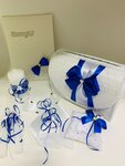 Домашний очаг "Синяя волна" сделанный своими руками отлично подойдет для украшения свадебного стола молодоженов выполненного в бело-синей гамме. Набор свечей "Синяя волна" оформлен белым нежным кружевом которое обрамляем свечи и бело-синими атласными