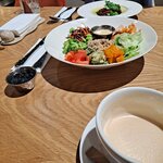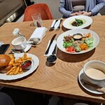 Забронировали столик за день до посещения — и были этому очень рады: нам досталось прекрасное место у окна. Если бы не забронировали, могли бы остаться без столика — в субботу вечером посетителей было достаточно. Интерьер красивый, расположение удобное. Официант сам сообщил, как долго будут готовиться блюда, не дожидаясь наших вопросов, — это приятно. Я заказала классический раф и боул с креветками. Раф был замечательный, а вот боулу очень не хватало соли, несколько ингредиентов были сладковатые. Обычно это решается соусом — хотя бы соевым, но соевого соуса в кафе не оказалось. Впечатление это не очень испортило, потому что мы пришли не голодные, но в будущем боул в этом месте заказывать не буду).