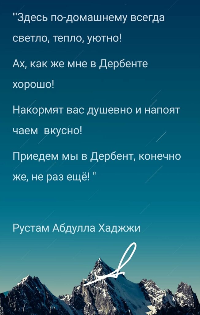 Приятно была удивлена, посетив кафе «мой Дербент»! Очень вкусная шаурма и вся выпечка, взяла домой на пробу разных изделий. Очень приветливые продавцы, работают в перчатках, прилавок чистый! Обратила внимание на ассортимент чаев и кофе, больше нигде на Мытищах не видела ни у кого. Очень вкусный и разнообразный: на травах, с ягодами и самое главное без сахара! Пока пробовала шаурму, зашли школьники и у них не хватило денег на покупку, так их накормили бесплатно! Поговорив с хозяином, узнала, что и пенсионеров угощают выпечкой бесплатно, есть дни, когда раздают хлеб! Вот такого не делает никто из предпринимателей Мытищ!!! Очень рада, что есть такое отличное место-кафе «Мой Дербент»!