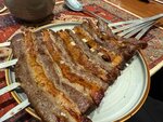Это очень крутой ресторан в центре города Ходжейли. Честно, не ожидал такого от них. Сервис на ура и все чисто, приятно. В целом: Персонал 10/10, официанты и администраторы очень добрые и помогают при неполадках, а подача еды это отдельное искусство. Атмосфера: 9/10, очень крутые разные залы и караоке комнаты, а общий зал вообще с крутым дизайном. Но есть и комнаты по скромнее. Время ожидания: 5/10, к сожалению нам пришлось ждать долго, из-за кухни, все работает медленнее чем обычно. Готовые закуски быстро, а еду долго. Еда: 10/10 очень вкусно и так сказать нежно. Готовят очень хорошо и с натуральными ингредиентами. А порции средние, но одного стейка одному человеку достаточно. Цена; 9/10, дешевле по сравнению с ресторанами в Нукусе, обходится на 30-40% дешевле при учете обслуживания. Ощущения: 👍 Итог: 8.8/10 Еще придем. 🤝