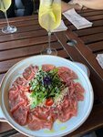 Ресторан красивый и хорошая атмосфера. Заказал пиццу и не особо понравилась: тесто, кетчуп, нарезка и руккола. Специфичный куриный суп очень диетический и ощущение, что сделан из кубиков и сухих специй. Пиво вкусное. Был в зале, так как на веранде холодно. В субботу людей мало. Музыка расслабляющая. Официанты спокойные и учтивые.