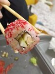 Заказывали роллы 08.03.2026 года, навынос, так как было уже довольно поздно выбор пал на это заведение. На первый взгляд привлекла скорость готовки ролло, ну и внешний вид на картинке. Хочу отметить, что время готовки было действительно небольшим, около 20 минут, в набор входил соевый соус, васаби и имбирь. Но тут сделаю пометочку, заказывали сет, расчитанный на 4 человек (такая информация указана непосредственно в меню), но палочек и соусов положили на двоих, что несколько странно. Запах хороший, на вид тоже выглядели неплохо, пока не начали их пробовать. Заказывали сет из запечённых роллов с креветкой, курицей, крабом и угрем. Вкуса данных продуктов вообще не чувствовалось, даже крабовых палочек, которые были в шапочке роддов. В первых же роллах в рис было завернуто яблоко, очень удивились, подумали, что это авторская фишка конкретно одного вида, посмеялись и начали пробовать остальные. Как выяснилось яблоки были абсолютно во всех роллах. Ради эксперимента решили попробовать вытащить яблоко из начинки и посмотреть что же там есть еще, но как оказалось больше ничего. Соседство, мягко говоря, ошеломительное - творожный сыр, яблоко и рис. Учитывая, что стоимость сета вроде и не особенно большая, около 2 тысяч, но даже за эту стоимость никак не ожидала получить роллы с яблоками. Если бы в меню об этом было где-то написано, то десять раз бы подумала, прежде чем заказать в этом месте. Заказывать здесь разумеется больше не будем