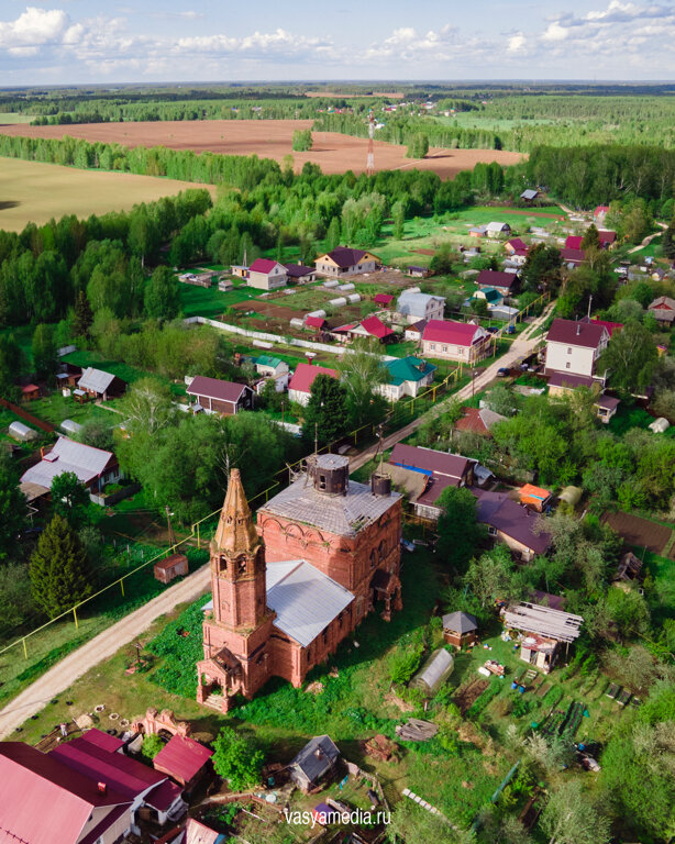 Каменная трехпрестольная церковь была возведена в 1852 году на месте старого деревянного храма. Пятиглавый храм в русско-византийском стиле был построен из красного кирпича и имел трапезную с шатровой колокольней. В 20-м веке судьба к ней была неблагосклонна и церковь после закрытия стала приходить в упадок. Еще несколько лет назад можно было пробраться внутрь и даже рассмотреть остатки росписей. Сейчас статус церкви мне непонятен: если идет реставрация, то ее следов нам обнаружить не удалось. Говорят, что "по известной причине" - деньги закончились. Очень жаль, что вместо восстановления старых храмов, идет строительство храмов-новоделов!