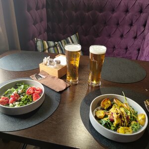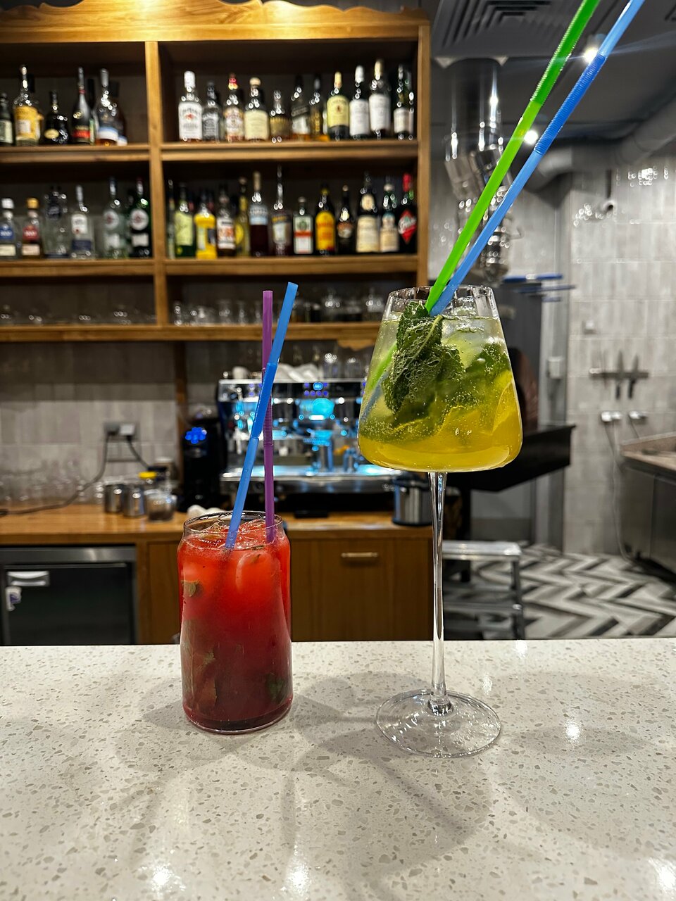 Muskat bar — это место, где вы можете насладиться вкусной едой и напитками, а также провести время с друзьями или в романтической обстановке. В меню представлены разнообразные блюда, такие как салат из морепродуктов, креветки в кляре, хрустящие баклажаны с моцареллой и другие. Кроме того, вы можете попробовать различные коктейли, такие как «Егермейстер» с апельсином и корицей, «Лимонад» с малиной и другие.