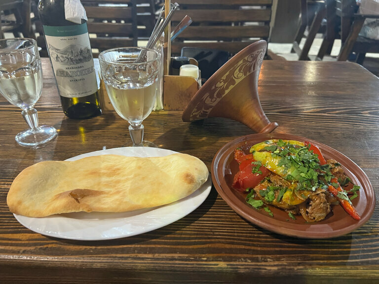 Кухня вкусная, мясо в горшочке с говядиной отличное, говядина аж разваливается Порции большие, все понравилось Единственное, найдите мангальщика)) это беда что мясо на гриле готовится на электрическом