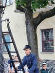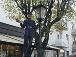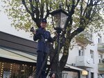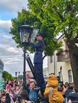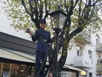На указателе выставлено время, во сколько вечером появится фонарщик в стилизованной форме и начнет зажигать фонари. Сама идея очень замечательная, и я ожидала увидеть некий сказочный красивый ритуал. В реальности всё выглядело несколько комично. В назначенное время фонарщик появляется с лестницей, совершенно по тихому, зажигает ближайшие четыре фонаря. В это время, толпа зрителей начинается бегать за ним, практически мешать ему зажигать эти фонари. Через 10 минут начинается стихийная фотосессия с фонарщиком. Моё резюме: идея прекрасная, а воплощение почти никакое. А можно было сделать сказочную театрализованную зарисовку.