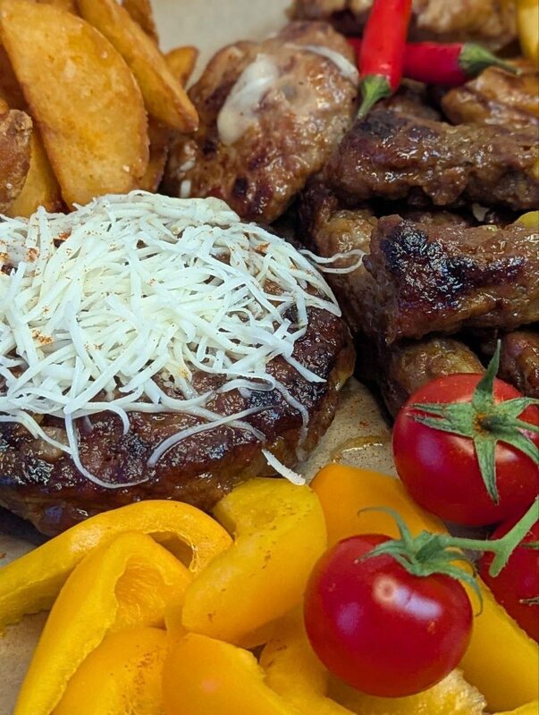 Тотальная мясная сборная: пунена и гурманска плескавицы, уштипцы, чевапи. К ним - фри, картошка по-сельски, овощи, лук, айвар, каймак и пита. Полтора килограма. Голодным не уйдёт никто.