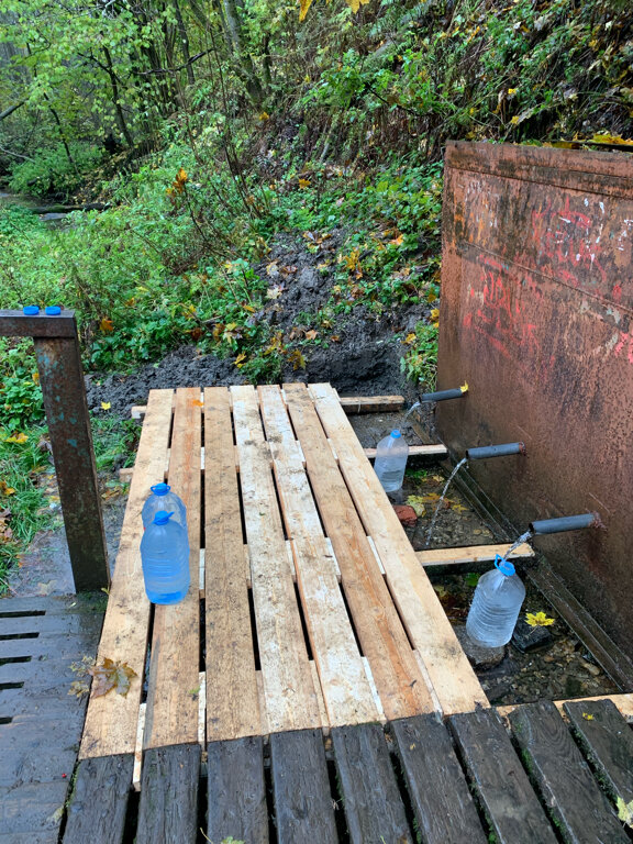 Качество воды хорошее, анализы не делал но вода не пахнет, не даёт осадок, не портится. Подход не совсем удобный, три трубы набирают баклажки быстро