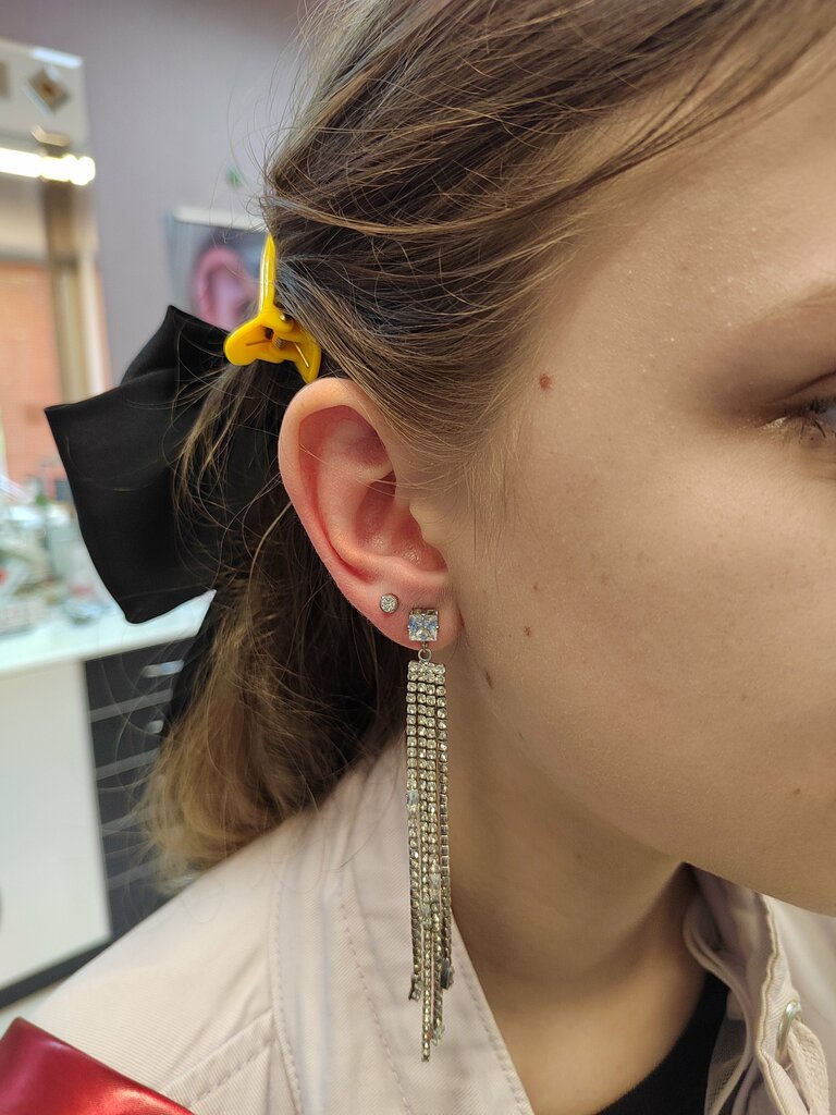 Быстрый и безболезненный прокол мочки уха. Уже в первую ночь спала как обычно, ничего не мешало. Мастер кропотливо относится к своему делу.