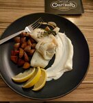 Командорский кальмар, жареный на оливковом масле со специями. Подается с творожным кремом, бейби-картофелем, дольками лимона. 250 гр.
