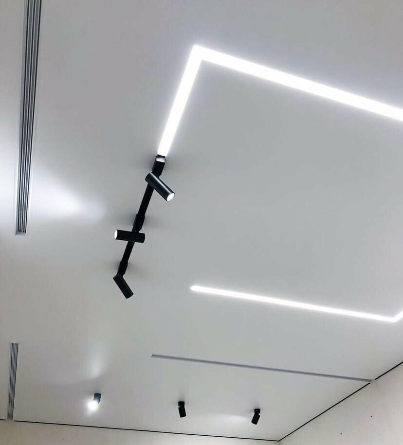 Современный натяжной потолок. Полотно примыкает к стене не плотно, а с зазором, он отбрасывает тень на стену и создается визуальный эффект свободно висящего полотна. Конструкция профиля не теряет форму во время эксплуатации. Защищает от затопления