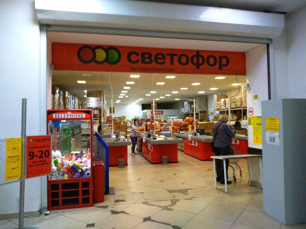 Отличный светофор и удобно расположен рядом с остановкой транспорта. Товар расположен понятно(если часто посещает,то не путаешся) и ассортимент широк.Часто его посещаю. Успехов труженикам магазина.