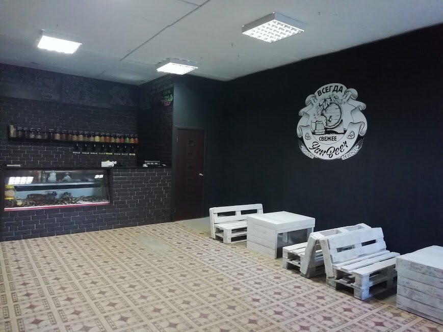 Пивняк ужасный запах дизайн внутри больше похоже на случайно скинутые «поддоны» во дворе Посетители есть пиво разбирается Качество и»разливушки» нормальное можно покупать рыбка тоже нормальная девушки добродушные Если бы не запах и дизайн то на четверку а так только 3