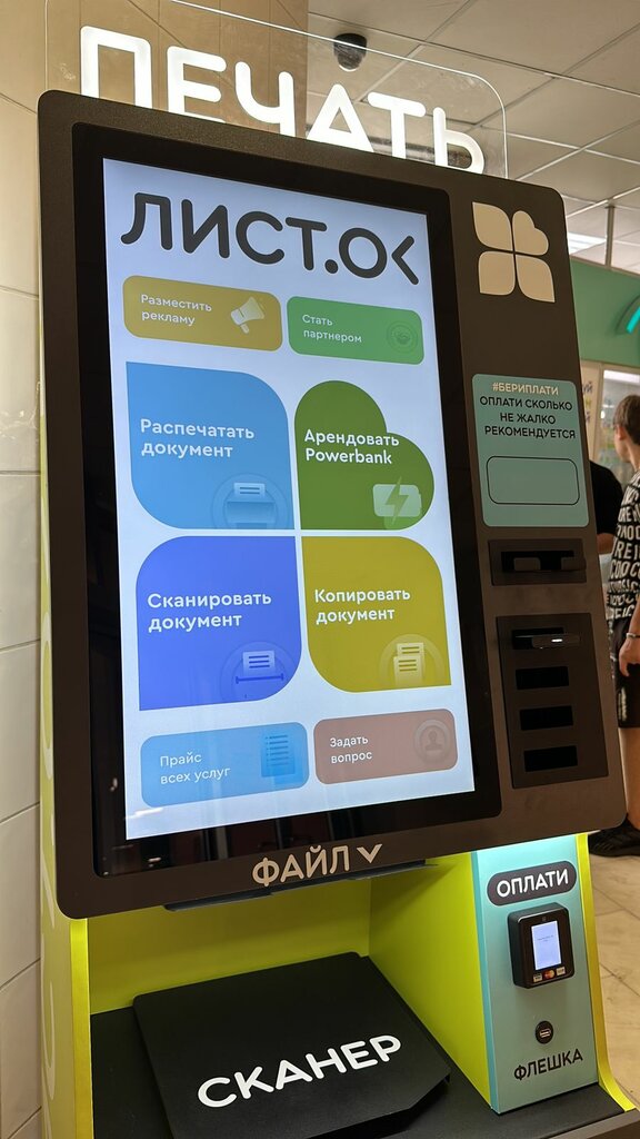 Печатал документы, очень удобно, что можно это сделать разными способами (флешка, телеграмм, веб сервис). Еще круто, что стоит возле круглосуточного перекрестка. Когда срочно нужно будет распечатать знаю куда идти