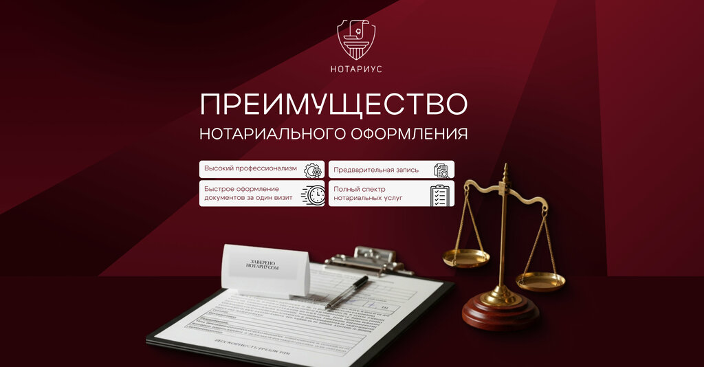 Notary services:transactions with shares in the authorized capital, adoption of closed will, real estate transactions, ownership for a share in the common property, issuance documents from the notary archive, inheritance certificates, certificate of the document presentation time, issuance of certificates, inquiry direction to individuals or legal entities, certificates of attorney, documents for registration of a legal entity in the Federal Tax Service, protesting bills, testimony of copies fidelity, conservation of evidence, transfering application of individual and legal entity to another person or legal person, public consultation, license agreements, unilateral contracts, acceptance of money and securities deposits, opening wil, issuance extracts from the notary acts registry, marriage contracts, witnessing signatures, issuance documents duplicates