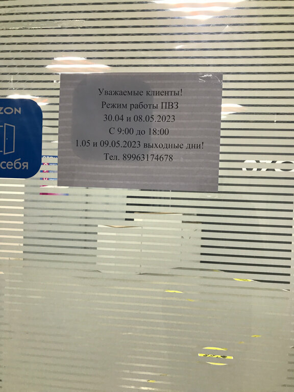 Добрый день. Пришёл в озон, чтобы забрать свой заказ. Никого нет. На телефон никто не отвечает