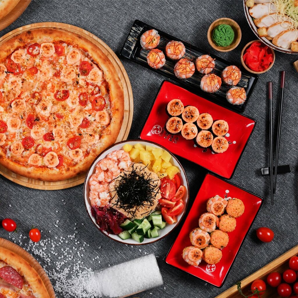 Variety of food:sushi and rolls, pizza, baking