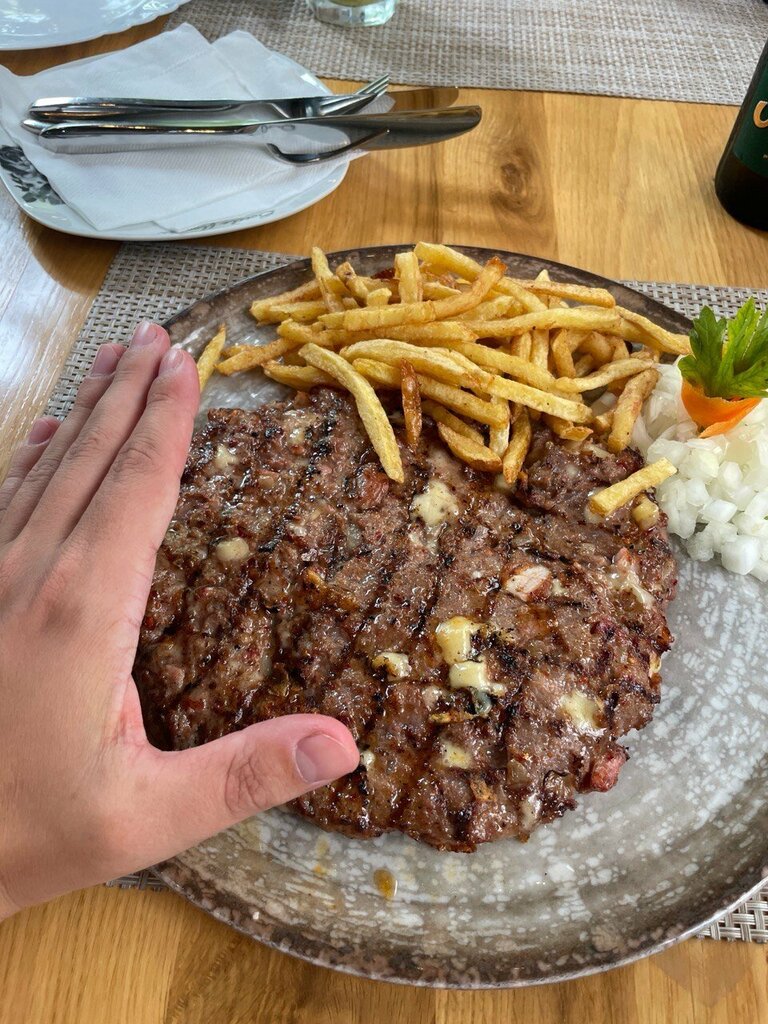 One of the favorite places in Budva, we went there many times. Large portions and very tasty meat dishes. In the photo, a gourmet splash and a man's hand for comparison)