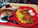 Cытное и вкусное блюдо из нежной курицы, ароматного риса и соуса. В качестве приятного дополнения — свежие помидоры и хрустящие огурцы