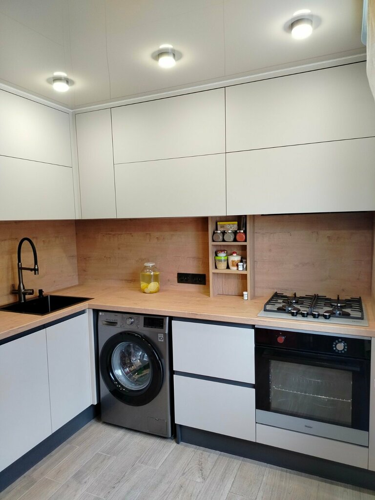 Проект реализован в малогабаритной кухне в г. Лепеле. Кухня модульная, в материале ЛДСП ЭГЕР