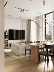 Современное пространство в тёплой нейтральной палитре, объединяющее гостиную, кухню-столовую и кабинет. Проект построен на сочетании природн...