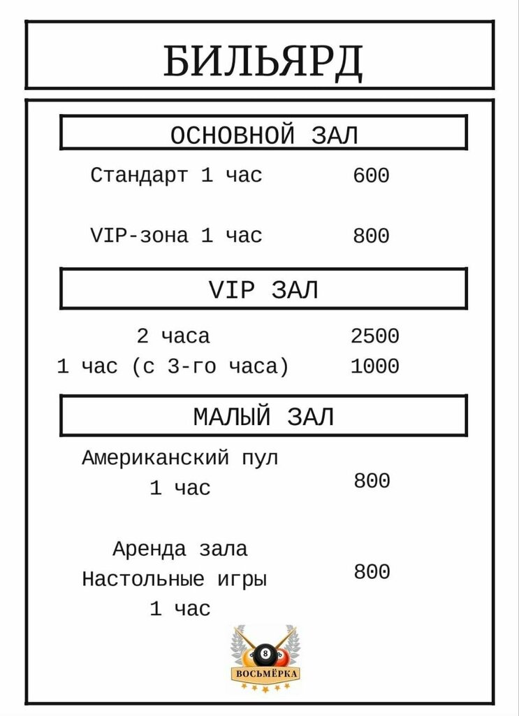 Почти идеально, если бы не одна «восьмёрка»! Бильярдный клуб «Восьмёрка» на Лопатинском руднике — это то самое классное место, где можно здорово провести время с друзьями. Всё на высоте: атмосфера приятная и живая, народу много, но не тесно, персонал встречает с улыбкой. Почему же не высший балл? Всё просто. Я, конечно, не чемпион мира по бильярду, но свой шар в лузу закатил бы чаще, если бы не мой верный «кривой» кий. Прямо как в названии клуба — «восьмёркой» его делали, что ли? Шутки шутками, но администрации стоит обратить внимание на состояние инвентаря. В остальном — клуб отличный, однозначно рекомендую зайти. Исправят кии — будет твёрдая восьмёрка!