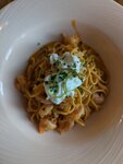Паста, сыр буррата, креветки, соус биск, масло сливочное, лимон, лук сибулет, специи