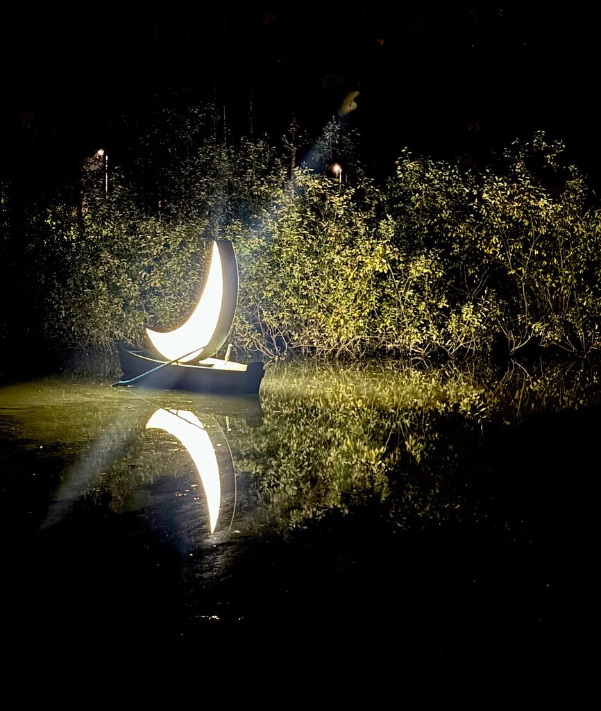 Небольшой пруд, на пруду домик для уток и сами утки. Посредине пруда лодка с вёслами и в ней Луна. Всё небольшое, камерное, "частное"...