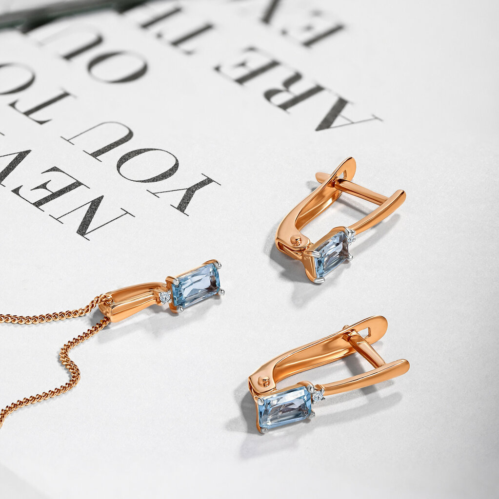 Утончённые и элегантные серьги из красного золота 585 пробы с родированием, английский замок. Вставка: натуральный топаз огранки октагон 5.0*3.0 - 2 шт., натуральный бриллиант огранки круг 17 граней 0,008 карат,. 2/3 - 2 шт.
