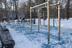 Хорошая площадка для занятий упражнениями на разном оборудовании. Вокруг площадки установлены скамейки. Площадка и скамейки почищены от снега.