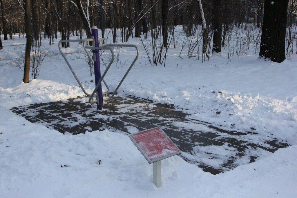 Одна из площадок со спортивным оборудованием, которых много расположено вдоль аллей парка.. Очищена от снега.