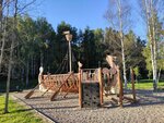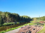 Парк порадовал нас своей ухоженностью и продуманной инфраструктурой. Приехав сюда на велосипедах (которые оставили у входа на специальной стоянке), мы обнаружили прекрасное сочетание природной красоты и современных удобств. Аккуратные дорожки, петляющие вдоль реки Лапки, ведут мимо многочисленных лавочек и гамаков. Особого внимания заслуживают детские зоны - несколько ярких площадок с прыгалками, лазалками и песочницей, где есть даже игрушечные экскаваторы. Главной изюминкой является сама горка, предлагающая отличный панорамный вид на реку и прилегающие территории. Также парк украшают оригинальные арт-объекты в виде маяка и ладьи, добавляющие ему особый шарм. Благодаря чистоте и тщательно продуманной организации, это место идеально подходит для семейного отдыха - здесь каждый найдет занятие по душе, будь то активные игры или спокойное созерцание природы.