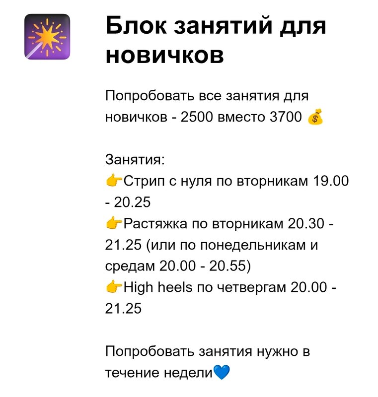 Хочу оставить свой отзыв и сказать огромное спасибо нашей студии и особенно Лере - тренеру! ✨ Хожу на растяжку и стрип-пластику — это просто любовь с первого занятия, хожу два года. Лера — настоящий профессионал, всегда подскажет, поддержит и правда помогает становиться лучше с каждым разом. Атмосфера дружелюбная: все девочки классные, заряженные, чувствуешь себя комфортно и уверенно, за несколько лет появились подруги и просто приятельские отношения вне студии. Отдельный плюс — возможность сниматься в видео. Это очень круто — видеть свой прогресс, всем советую Лера именно тот человек, который заражает любовью к танцам. На растяжке терпеливо помогает, даже когда сложно, а на стрипе раскрывает так, что забываешь о стеснении. Люблю, обожаю, всем советую ❤️