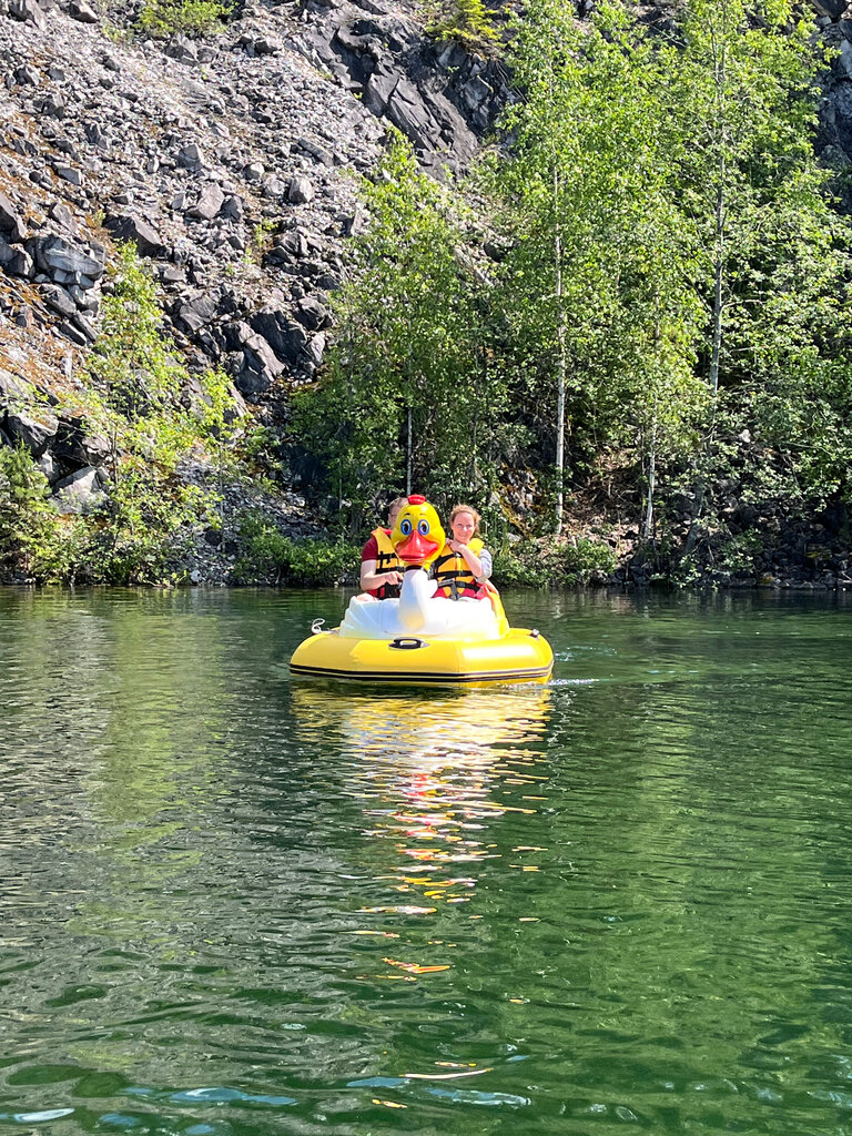 На южной стороне озера Монферрана в Рускеале обустроен пункт проката катамаранов. Видимо для того, чтобы уставшие служители горного парка могли передохнуть от вездесущих посетителей. Именно для этого придуманы заградительные цены на аренду катамаранов и, особенно, бамперных лодочек. И правда. Таким образом и персонал, и средства мореплавания сохраняются лучше.