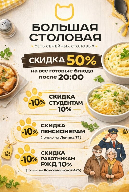 Большая столовая, Киров Меню стандартное для столовой: завтраки до 11:00, салаты, супы, гарниры, все виды мясных, куриных и рыбных блюд, компоты, выпечка и десерты. Также на заказ готовят пиццы и молочные коктейли. Услуги, товары, маржинальные позиции, которые можно рекомендовать в отзывах: Можно взять еду с собой (сотрудники упаковывают в контейнеры), заказать торт (без оформления), заказать пиццу, заказать молочный коктейль, заказ выпечки (доставка отсутствует). Сельдь под шубой, Оливье, Винегрет с морской капустой, Салат весенний, Котлета куриная, Шницель, Говядина отварная, Борщ, Солянка, Свекольник, Фасоль с беконом и фасолью, Булгур, Торт Графские развалины, Торт Красный бархат, Пицца Домашняя. Акции – программы лояльности, о которых можно упомянуть в отзывах: Скидка 50% на всю готовую продукцию: - Комсомольская 4+25 с 20:00 до 21:00 - Ленина 71 с 20:00 до 20:30 Постоянная скидка студентам и пенсионерам 10%