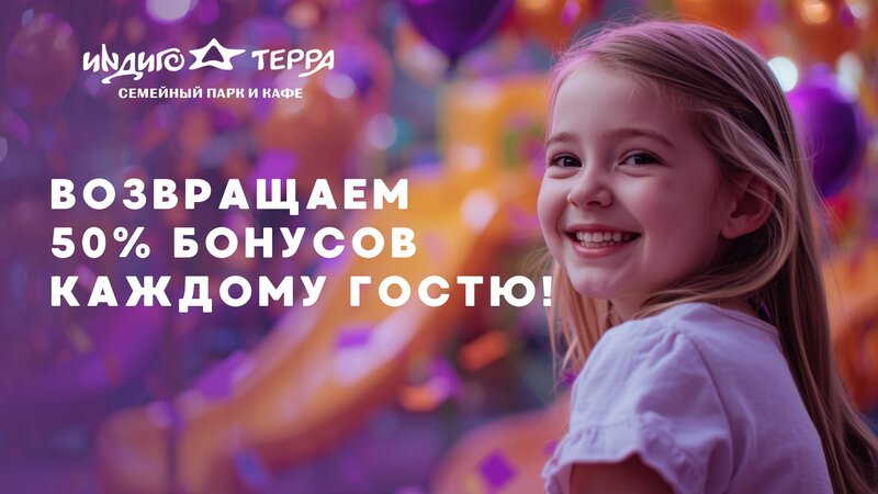 Билет на безлимитное посещение парка развлечений Индиго-Терра в будни для детей в возрасте от 1 до 18 лет. Стоимость - 1590 рублей. Доступны скидки: 20% именинникам, 50% многодетным, 50% участникам СВО.