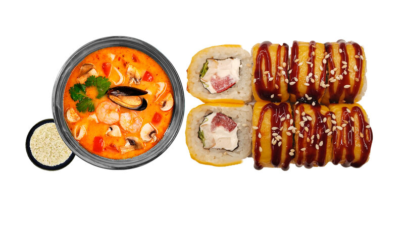 214г | ккал Состав: рис, нори, сыр сливочный, угорь, лосось, масаго, соус унаги, кунжут