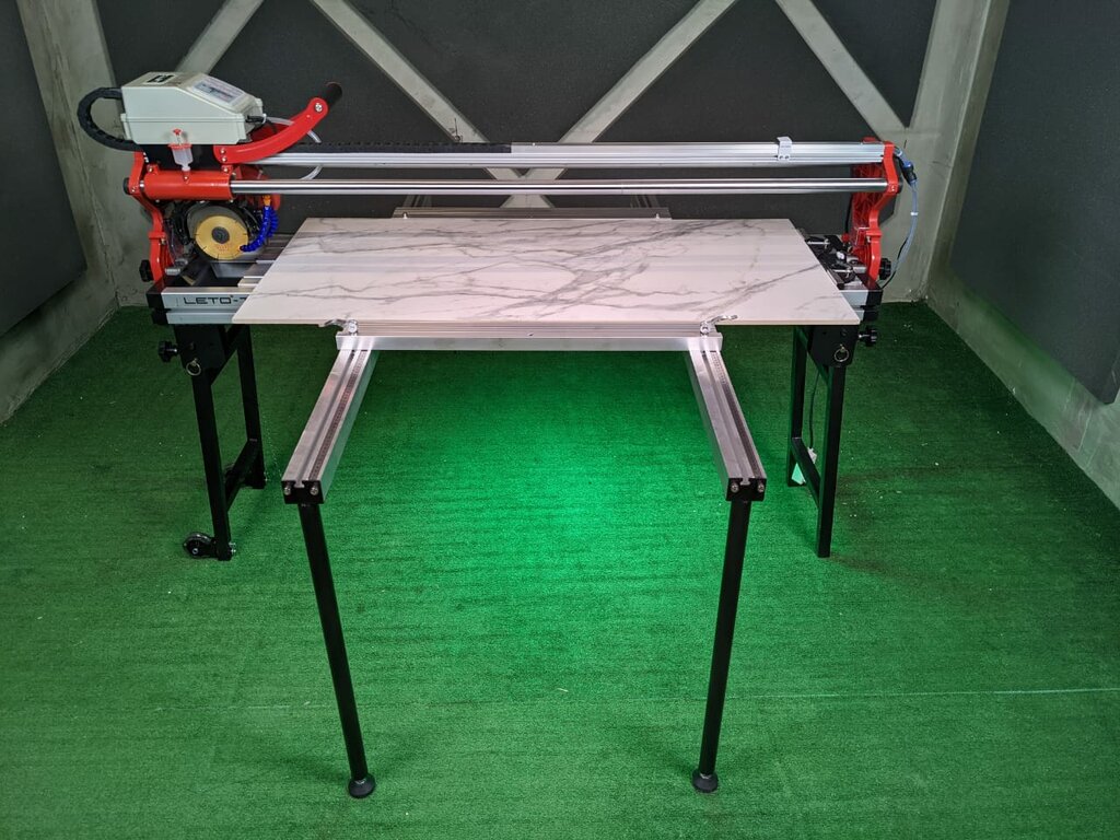 Электрический плиткорез LETO TOOLS T8-18 с автоподачей каретки двигателя, рабочим столом 1800 мм и водяным охлаждением. Станок для крупноформатной плитки, 1620 Вт, 13000 об/мин. Прямой рез, снятие фаски, заусовка до 50, скругление, нарезание борозд