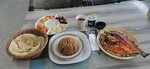 It's a decent enough, authentic, undistinguished place. There is a menu in English. The English-speaking waiter. I pointed to a line on the menu, and they took me to an iced chicken stand with fresh fish. The waiter showed which line of the menu corresponds to which fish. There are about 10 different types of fish. From 25 aed to 40 aed for a set combo lunch, depending on the type of fish. The fish are big. I pointed at the dorado in the window, and the waiter took it and handed it to the kitchen. I waited about 10 minutes for cooking. While I was waiting, I asked for tea. The tea was brought by a deliveryman, apparently from a nearby coffee shop. At first he brought a small glass of tea, but then the deliveryman returned and brought a large glass of tea. The waiter apologized and said that he had forgotten that Russians drink tea with glasses. The tea was sweet by default. The photo shows a combo lunch that I took with tea for 47 aed (a set of pickled foods with sauce, 3 pita fresh tandoor tortillas, dark rice and fish). That's too much for one. The hall is clean, IT DOESN'T stink, there is a toilet and a place to wash your hands, the plumbing is old, but it works fine. The only thing that confused me was that there were several small flies flying around the hall. There are always clean plates and disposable appliances on the tables. When I sat down at the selected table, the set of dishes was immediately changed without my request. There is a passability in the establishment - periodically people come in and take food to take away. Three other clients were sitting with me in the hall-a couple of locals, apparently on a date, and a man in a tie, trousers, and shirt.