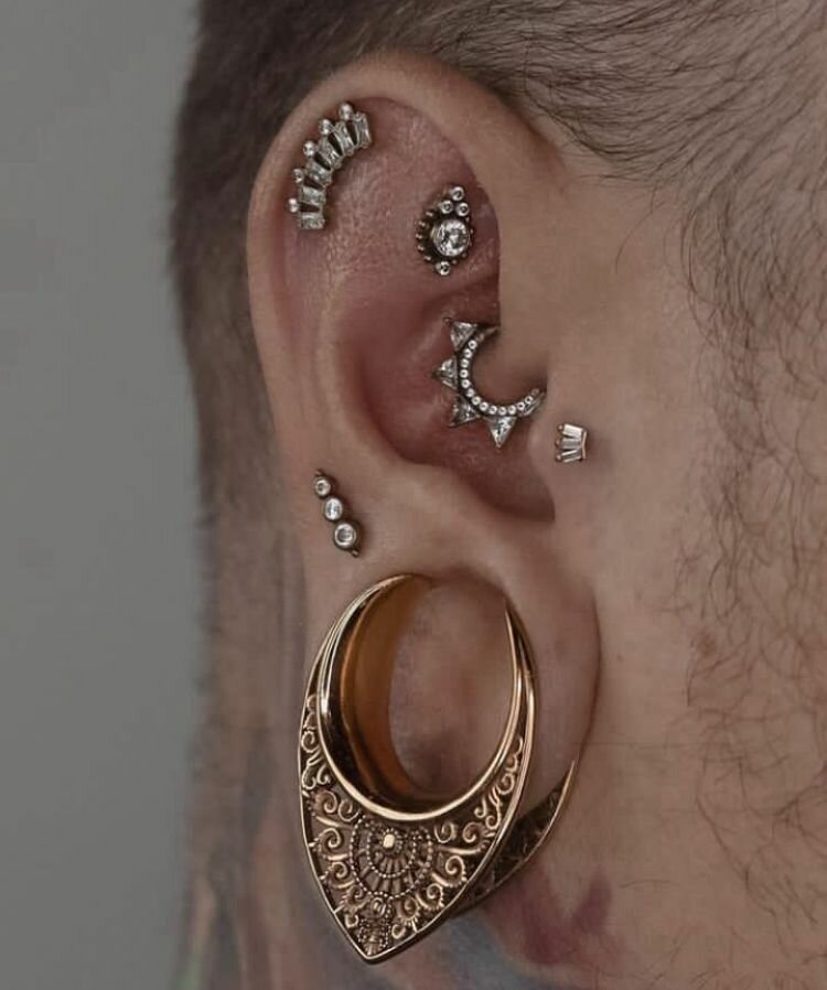Types of body piercing:ears, face, tongue, navel, chest, intimate, nose