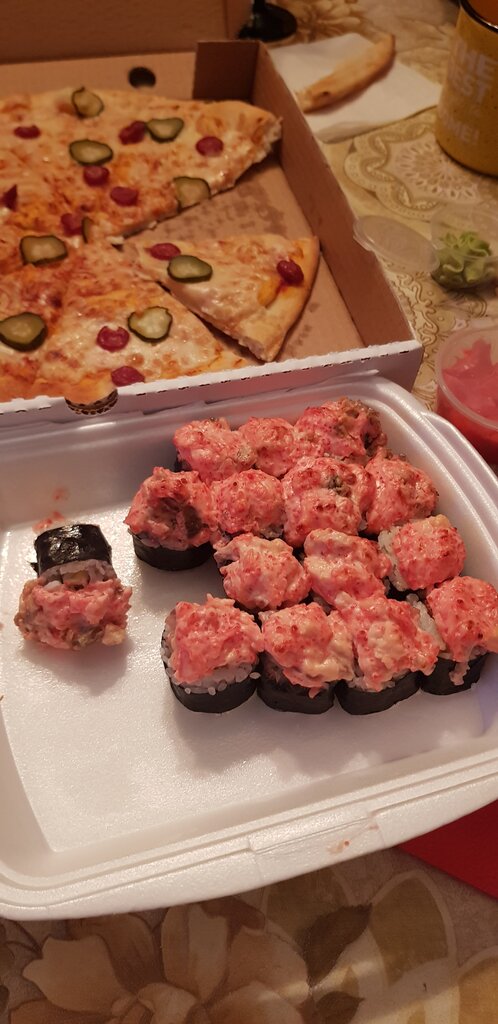 Разместили заказ через Деливери клаб в 17:45, время доставки было указано 18:20-18:30. Перезвонили в Деливери первый раз в 19:10 и оператор сказал, что курьер приедет чере 20 минут, второй раз перезвонили в 19:55 и нам снова ответили что курьер в пути и сейчас с нами свяжется. В итоге мы сами позвонили по номеру указанному на сайте и нам ответили, что курьер приедет через 10 минут. Пишу отзыв в 20:20, курьера до сих пор нет. Надеюсь мой отзыв кому-нибудь поможет не сделать ошибку в выборе ресторана. Не советую этот ресторан. Привезли роллы и пиццу:)), лучше бы позвонили и сказали, что заказ случайно увезли на другой адрес, чем так себя позорить. Фото приложила.
