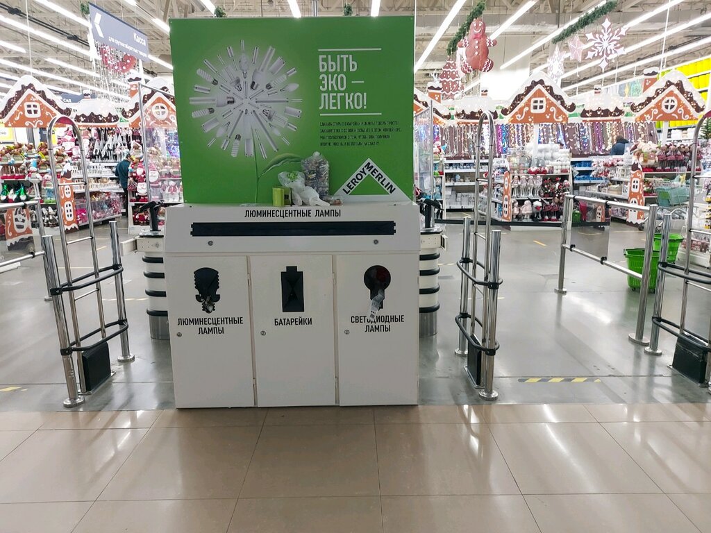 Не знаю где там на 2-м этаже, мне найти так и не удалось. Но зато точно есть на 3-м этаже, там, где Леруа Мерлен, или как он теперь называется - Лемана Про. У него три входа: слева, по центру и справа. Контейнер для батареек и ламп накаливания стоит между центральным и правым входами - там, где банкоматы, весы и пункт самостоятельной проверки техники, и один из двух мест для упаковки купленных товаров. Стандартный контейнер для Лемана Про, у них около многих магазинов такие есть, но в основном за МКАД. А здесь прямо в черте Города. Очень удобно.