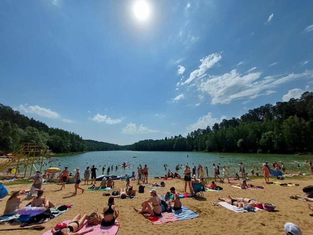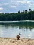 Красивое озеро в лесных берегах. Песочный пляж довольно широкий. Вход в воду пологий с песчаным дном. На машине подъехать проблематично. Есть лесная дорога, но очень уж кривая. На пляже в наличии прокат сапов и лежаков, баня и даже надувная водная горка.