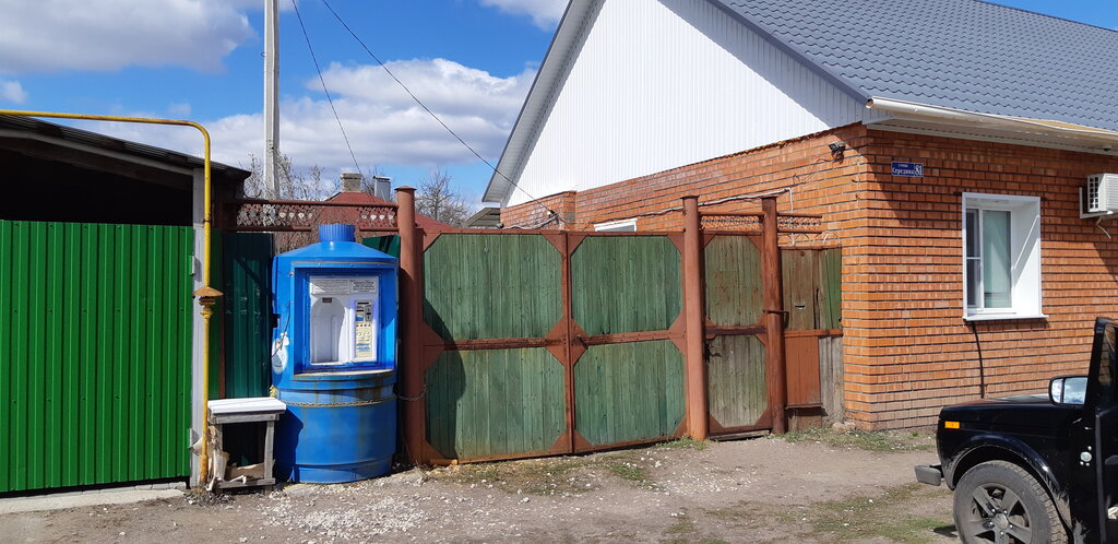 Обычный частный дом подъезд к которому немного отсыпан щебнем, сама установка для воды уже выгорела и немного пошарпана. В эпоху когда руками лишний раз не за что лучше не браться не удобно открой ручку машины возьми деньги в руки и тут же возьмись за горлышко бутылки открути, а потом закрути. А вообще надо отдать должное несмотря на всё перечисленное сколько раз набирал вода всегда наичистейшая и дешевле выходит.
