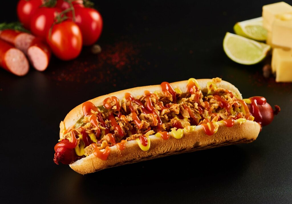 Булочка, куриная сосиска, огурец соленый, лук маринованный, лук жареный, сыр, бекон, горчица, кетчуп 200 гр