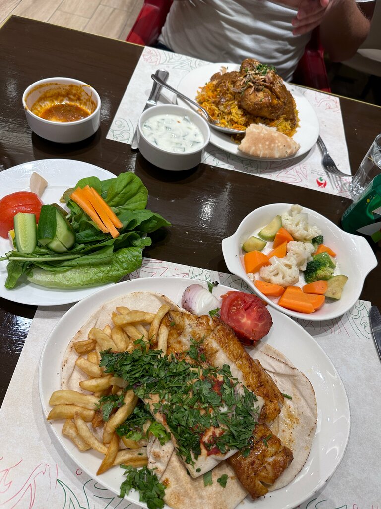 We went to eat in the evening, took two chicken kebabs and one shawarma. The shawarma was with mutton, to be honest, for an amateur. Although they just asked for meat, either the waiter did not understand, or they all go with mutton, they did not understand. But the chicken kebab was very tasty, the children ate it with pleasure. The kebab comes with French fries, two sauces. Before the start, they brought out a plate with herbs and pickles, it was very tasty. There are three tortillas, they are also very tasty. The price is acceptable. We took three dishes for four, and everyone ate. They work very hard on delivery, the flow of deliverers is endless. If you don't really like mutton, then ask for everything chicken. The mutton is plowing. I give a rating of 5 because there is nothing particularly tolerable in the vicinity. We also ate at the wtc mall nearby on the food court. We also took ready-made food from the Lulu hypermarket, very decent and not expensive.