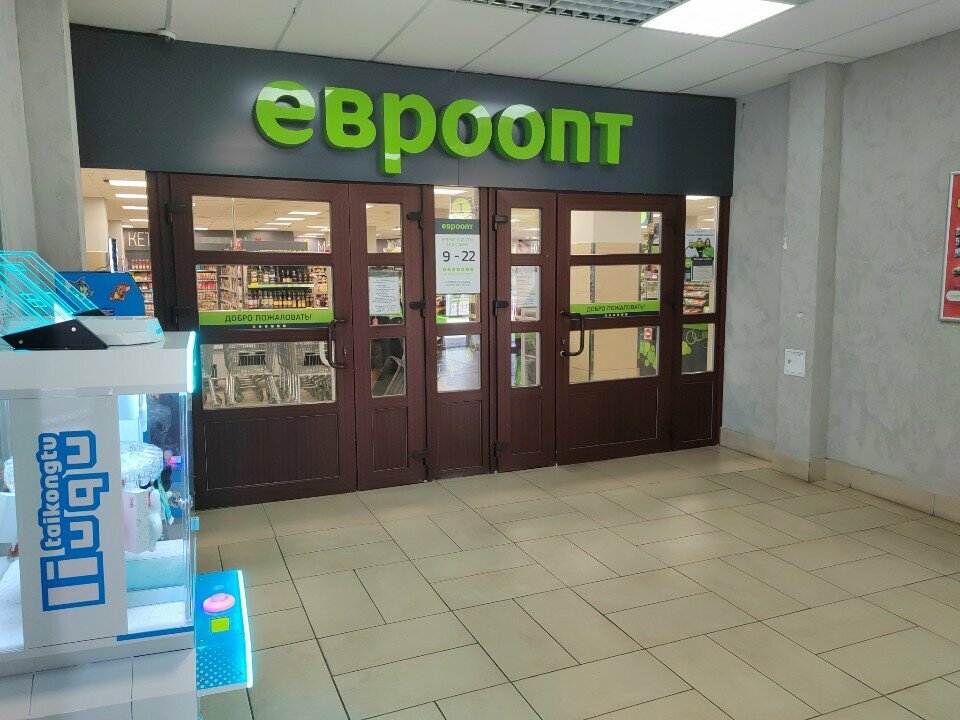 Good euroopt, always clean, you can order pizza, the staff is polite. The assortment is diverse. There are self-service cash desks. Convenient location. We go there very often.